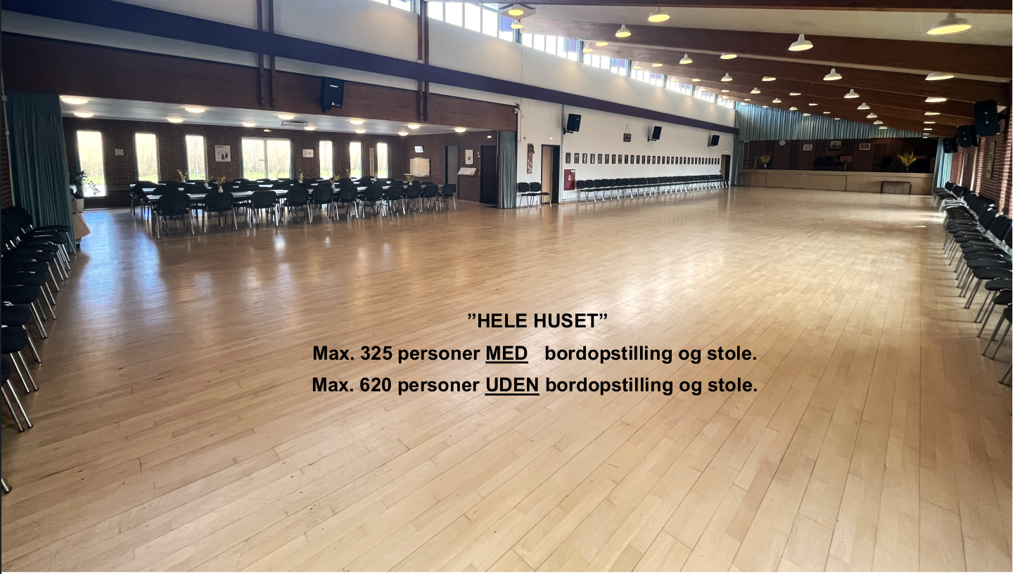 • ”Hele huset” op til 325 personer med bordopstilling og op til 620 uden bordopstilling.